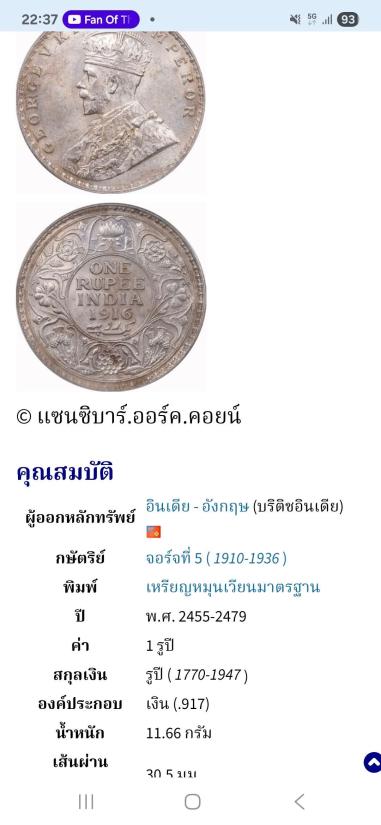 เหรียญต่างประเทศ เหรียญ ONE RUPEE INDIA 1919 เนื้อเงิน |