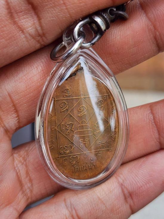 ด้านหลัง มีอักขระยันต์ ใต้ยันต์มีอักขระภาษาไทยเขียนว่า "วัดแม่น้ำ"
