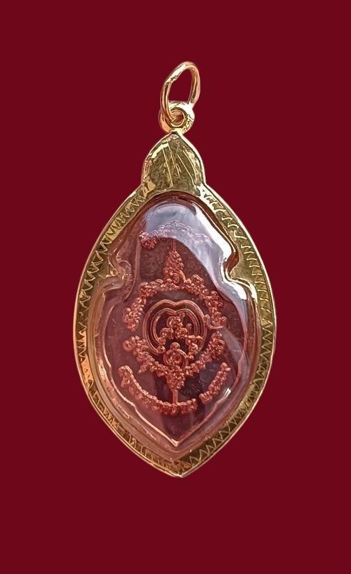 เหรียญท้าวเวสสุวรรณ หลวงพ่ออิฏฐ์ พิมพ์ใบสาเก เนื้อทองแดง ปี 59 เลี่ยมทองคำ 75%
