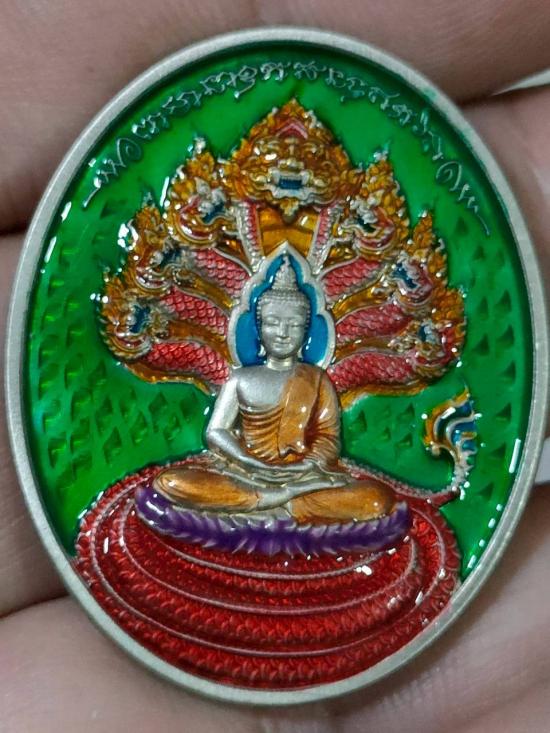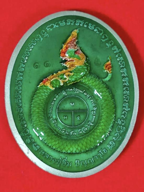 เหรียญปรกโพธิ์พญานาค หลวงปู่อิ่ม วัดทุ่งนาใหม่ จ.นครศรีธรรมาราช เนื้ออัลปาก้าซาตินลงยาเขียวลงยาพญานาค ลงยาจีวร หลังลงยาเขียว ลงยาพญานาค ตอก โค๊ตเม็ดงา ตอกหมายเลข 11 |