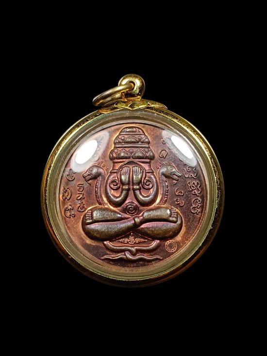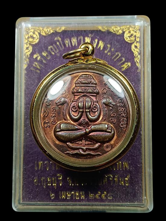 เหรียญปิดตาพังพระกาฬ เทวาลัยกุยบุรี เนื้อทองแดง พร้อมเลี่ยมกรอบอิตาลีแบบผ่าหวาาย มีรอยแขวนมาบ้างตามสภาพ |