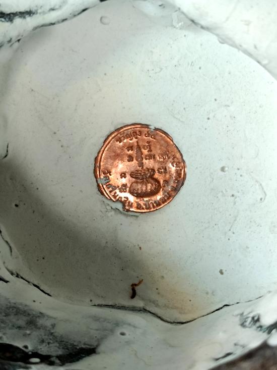 พระบูชาพระสังกัจจายน์มหาลาภ ขนาดหน้าตัก 5 นิ้ว เนื้อโลหะผิวมันปู ปี 2555 หลวงพ่อเพี้ยน อคฺคธมฺโม วัดเกริ่นกฐิน จ.ลพบุรี ใต้ฐานพระได้อุดปูนขาวและฝังเหรียญขวัญถุงเนื้อทองแดง ปี2554 ไว้ด้วย 1 เหรียญ คับผม