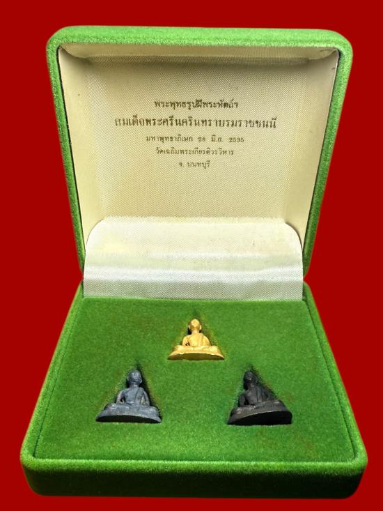 พระพุทธรูปฝีพระหัตถ์ สมเด็จย่า ปี35 วัดเฉลิมพระเกียรติวรวิหาร จ.นนทบุรี 1ชุด3 องค์ เงิน นวะ กะไหล่ทอง สวยๆกล่องเดิมครับ |