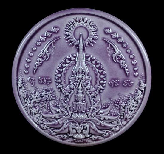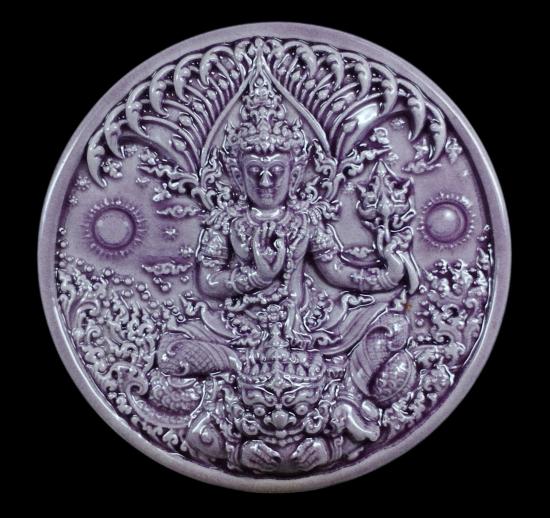 พระเทวราชโพธิสัตว์ จตุคามรามเทพ อภิปัญญามหาเศรษฐี ผู้มีปัญญาประดุจดั่งมีทรัพย์ โดยมูลนิธิศิลปกรรม พ.ศ. 2550 (พุทธศิลป์รูปแบบของ อาจารย์เฉลิมชัย โฆษิตพิพัฒน์) ลูกเคลือบสีม่วง ขนาด 5 cm. สภาพสมบูรณ์ ไม่มีตำหนิ พร้อมกล่องเดิม |