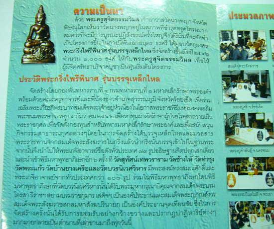 "พระกริ่งไพรีพินาศ รุ่นบรรจุเหล็กไหล" จัดสร้างโดยกองพันทหารราบที่ 4 กรมทหารราบที่ 1 มหาดเล็กรักษาพระองค์ และคณะ เมื่อปี 2542-2543 เฉลิมพระเกียรติพระบาทสมเด็จพระเจ้าอยู่หัว เนื่องในวโรกาสมหามงคลเฉลิมพระชนมพรรษา 6 รอบ 72 พรรษา โดยมีสมเด็จพระญาณสังวร สมเด็พระสังฆราช สกลมหาสังฆปริณายก ทรงเป็นประธาน..." ภายในองค์พระบรรจุเหล็กไหล มวลสารพระราชทาน และแผ่นยันต์ จากพระเถระผู้เจริญคาถาอาคม มีพระสงฆ์ทรงสมณศักดิ์และพระเกจิอาจารย์ชื่อดังอธิษฐานจิตปลุกเสกเดี่ยวทั่วประเทศ และเข้าพิธีมหาพุทธาภิเษกหลายครั้ง ทั้งในพระอุโบสถวัดสุทัศน์เทพวราราม วัดช้างให้ วัดพระแก้ว และวัดบวรนิเวศวิหาร เป็นต้น