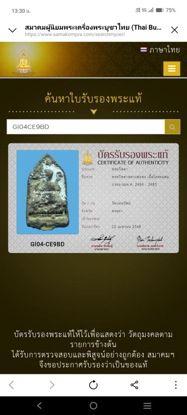 บัตรรับรองพระเครื่องของสมาคมพระเครื่องพระบูชาไทยจัดส่งพร้อมไปให้ครับ
