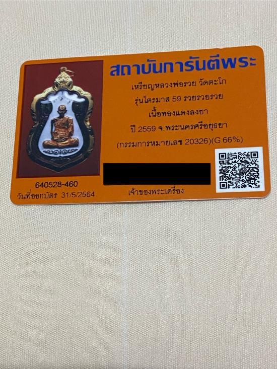 เหรียญหลวงพ่อรวย วัดตะโก รุ่นไตรมาส59 รวย รวย รวย เนื้อทองแดงลงยา ปี2559 จ.พระนครศรีอยุธยา(กรรมการหมายเลข20326)เลี่ยมทองพร้อมบัตรรับรองฯ โอนเงินแล้วแจ้งรายละเอียดการโอนทาง Mailbox ของเวปจี ได้รับแจ้งว่าโอนเงินแล้วจะส่งพระภายใน 3 วันทำการ