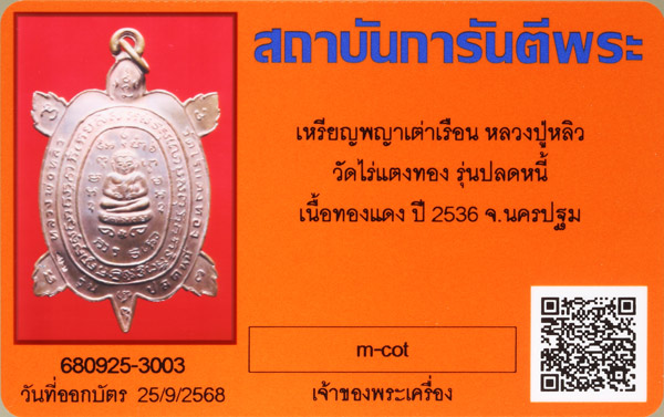 เหรียญเต่าปลดหนี้(รุ่นแรก) หลวงปู่หลิว วัดไร่แตงทอง เนื้อทองแดง ปี2536 เหรียญนี้ผิวสวยเดิมครับ