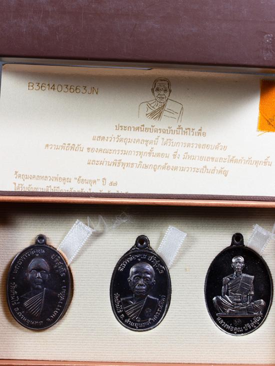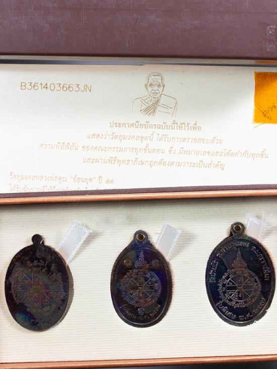 เหรียญหลวงพ่อคูณ ปริสุทฺโธ เนื้อทองแดงรมดำ ย้อนยุคปี 12 , 17 , 19 ตอกโค็ตและหมายเลข พร้อมใบประกาศนียบัตรติดจีวร ในกล่องผ้าสวยหรู