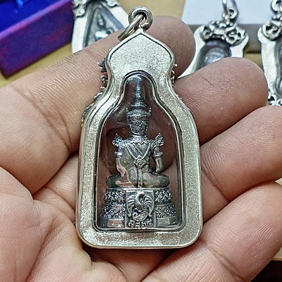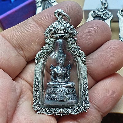 พระแก้วมรกต กรมสรรพสามิตจัดสร้าง วัดพระศรีรัตนศาสดาราม เนื้อเงิน ปี 2539 พร้อมเลี่ยมกรอบเงินแท้ 92.5% ขึ้น งานมือ กรอบหนา รมดำ สวยๆ.. กล่องเดิม /