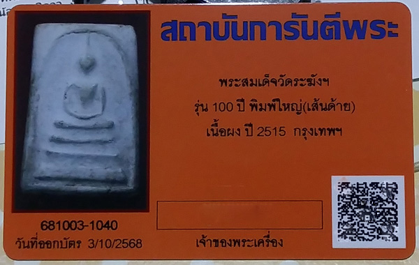 พระสมเด็จวัดระฆัง รุ่น100 ปี พิมพ์ใหญ่(เส้นด้าย) ปี 2515 สภาพสวยเดิม+บัตรรับรองพระแท้ครับ
