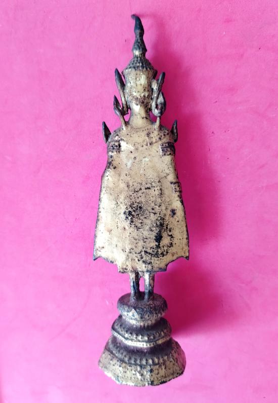 พระพุทธรูปบูชาสมัยรัตน ปลายเกศงอมาข้างหน้าเนื้อสัมฤทธิ์ ขนาดยืนจากฐานถึงปลายเกศ 16 เซนติเมตร ลงลักปิดทองร่องชาด ใต้ฐานดินไทย​ สภาพรักทองสวยสมบูรณ์​ รับประกันตามกฏครับ |