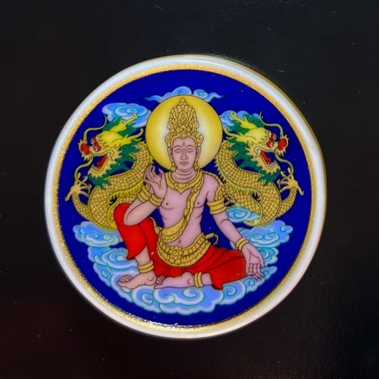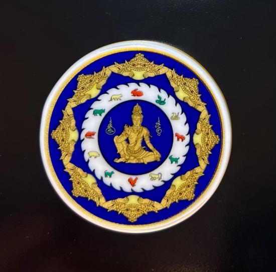 จตุคามรามเทพ เนื้อกระเบื้องเคลือบเบญจรงค์สีน้ำเงิน รุ่นบารมีเศรษฐีเงินล้าน 5 ซ.ม. เลข 3103 กล่องเดิม |