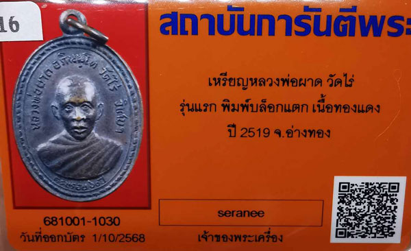 เหรียญหลวงพ่อผาด วัดไร่ รุ่นแรก พิมพ์บล็อกแตก เนื้อทองแดง ห่วงเดิม ปี2519 จ.อ่างทอง + บัตรG-pra สภาพเดิมค่ะ |