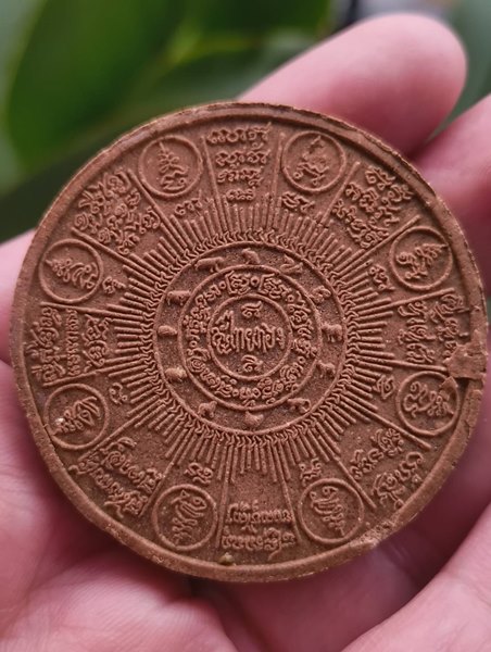 ชื่อพระเครื่อง ปฐมอรหันต์สุวรรณภูมิ 2547 เนื้อว่านไม้มงคล ธรรมจักร ไม่มีองค์พระ ขนาด5ซ.ม.