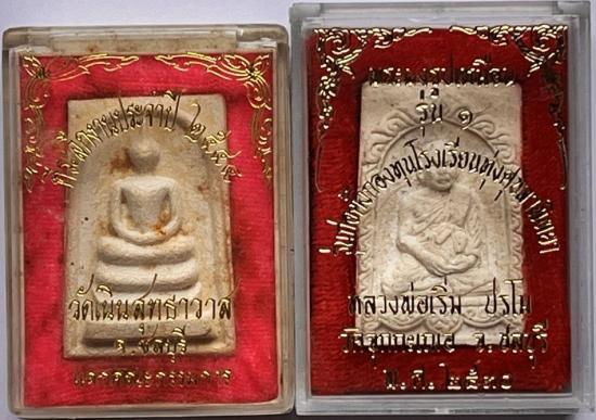 พระผงรูปเหมือน หลวงปู่เริ่ม วัดจุกเฌอ ชลบุรี รุ่นตั้งมูลนิธิ ร.ร. ทุ่งศุขลาพิทยาคม ปี2530 มีเกศา + พระสมเด็จ หลวงปู่เกลี้ยง วัดเนินสุทธาวาส ชลบุรี ปี 2536 พิมพ์ใหญ่ เคาะเดียว |