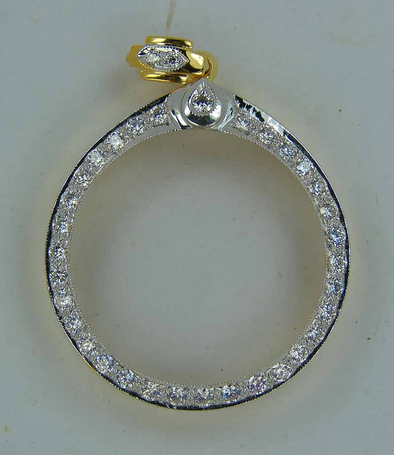 กรอบทองคำ ล้อมเพชร ห่วงเพชร ทรงกลม ขนาด เส้นผ่าศูนย์ กลาง ขอบใน 2.5 ซม. ใส่ ลูกอม หรือไซด์ไกล้เคียง ( ฝังเพชร CZ 36 เม็ด ) ชุบหน้าขาว งานขึ้นมือ น้ำหนัก 3.68 กรัม เปอร์เซ็นต์ทอง 63-70 เปอร์เซ็นต์ รับป |