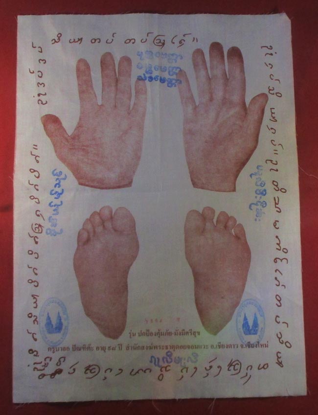ผ้ายันต์ รอยมือ รอยท้าว ครูบออ ปัณฑิต๊ะ อายุ ๙๘ ปี สำนักสงฆ์พระธาตุดอนจอมแวะ อ.เชียงดาว จ.เชียงใหม่ ครับ (พระบ้าน ครับ) |