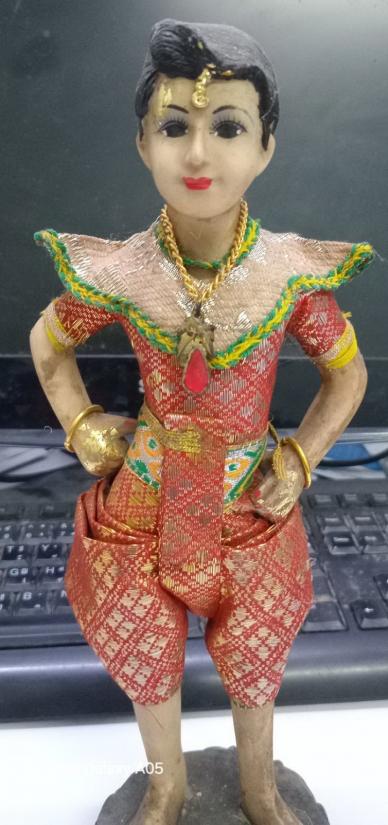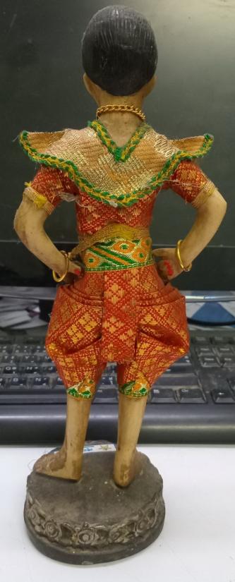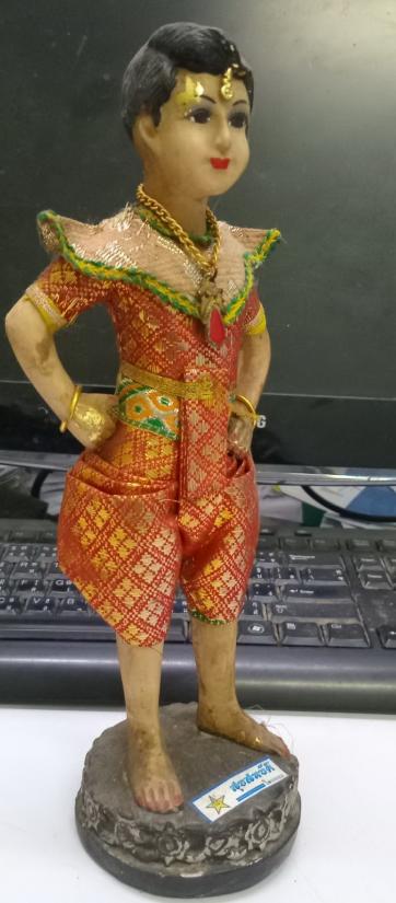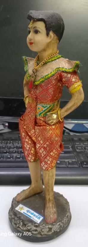 รูปหล่อกุมารทองทรงเครื่องชุดไทย นุ่งโจงกระเบน เนื้อเรซิ่นเก่า สูงรวมประมาณ 11.5 นิ้ว |