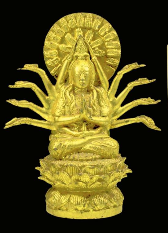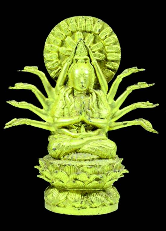 รูปหล่อเจ้าแม่กวนอิม ปางพันกร เนื้อโลหะผสมขนาดบูชา หน้าตัก3นิ้ว เนื้อหาเก่ามีศิลปะสวยปราณีต เช่าเหมามาแถวย่านเยาวราชหลายปีแล้วจำไม่ได้เจ้าของเดิมบอกว่าเช่ามาจากศาลเจ้าแม่กวนอิม ผ่านพิธีการปลุกเสกเบิกเนตรแล้ว ประมาณการสร้างที่เจ้าของบอกเช่ามาประมาณปี2515 เอาเป็นว่าปีนี้ใครทานเจ เคาะเจ้าแม่ไปบูชาจะช่วยเสริมดวงการเงิน การงาน การเรียน การค้าขาย และความรักให้ประสบผลสำเร็จดังพรที่ขอ |