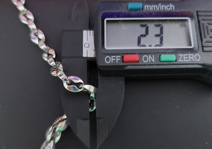สร้อยสแตนเลสลายเมล็ดกาแฟ ยาว 26 นื้ว พร้อมสปริงก้ามปูสแตนเลสหมุนได้ เมล็ดกาแฟกว้าง 5 มม. หนา 2.3 มม.