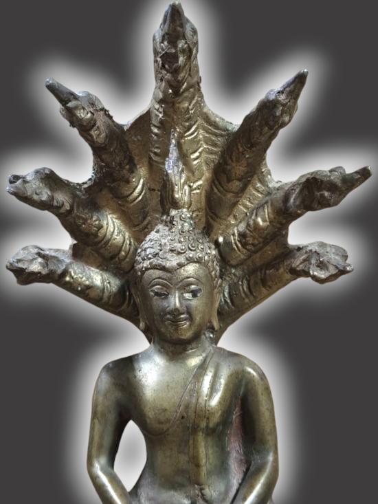มีพญานาคขดตัว 7 รอบเป็นบัลลังก์ และแผ่พังพาน 7 เศียรอยู่เหนือพระเศียรของพระพุทธเจ้า