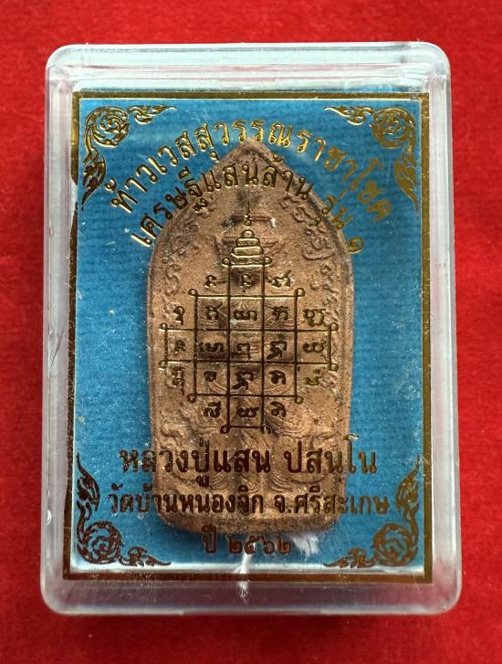 ท้าวเวสสุวรรณราชาโชค รุ่น 1 หลวงปู่แสน วัดบ้านหนองจิก จ.ศรีษะเกษ ปี 2562 เนื้อดินเผาอุดปงฝังกระบองเมฆพัทธ์ พระธาตุ ข้าวสารหิน หมายเลข 264 |