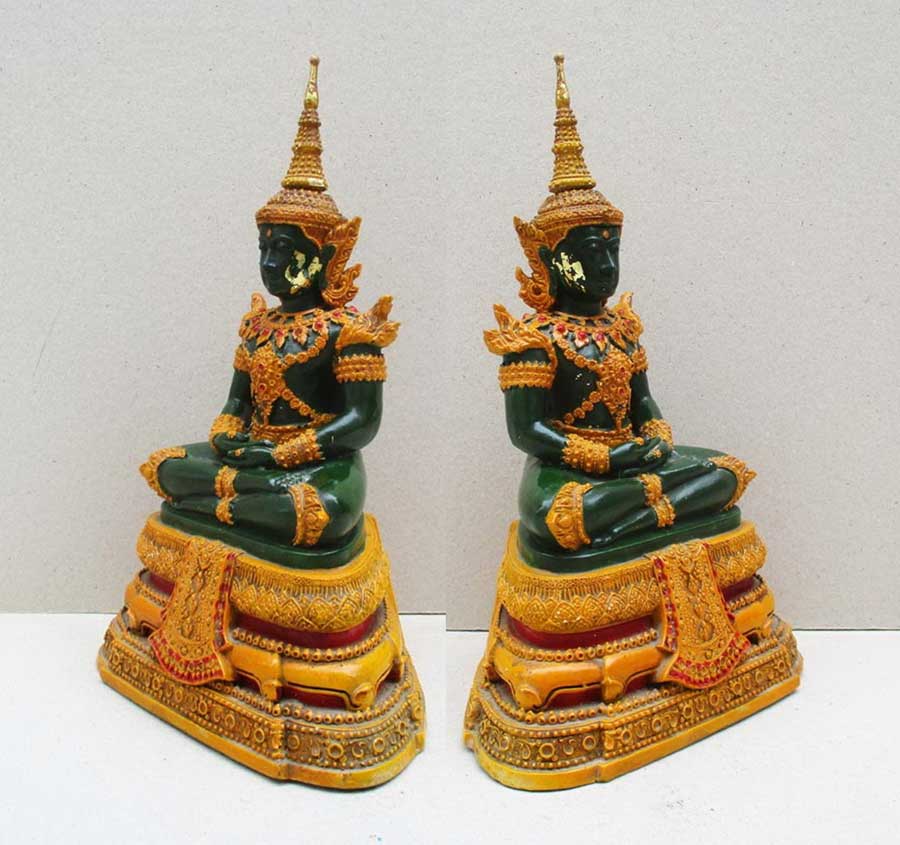 พระแก้วมรกต โดยสำนักพุทธเนรมิตประทีป เนื้อเรซิ่น เกศถอดได้ใต้ฐานอุดปูน ( สภาพเก่า ผิวปรอทเงาวับๆ !! ) |
