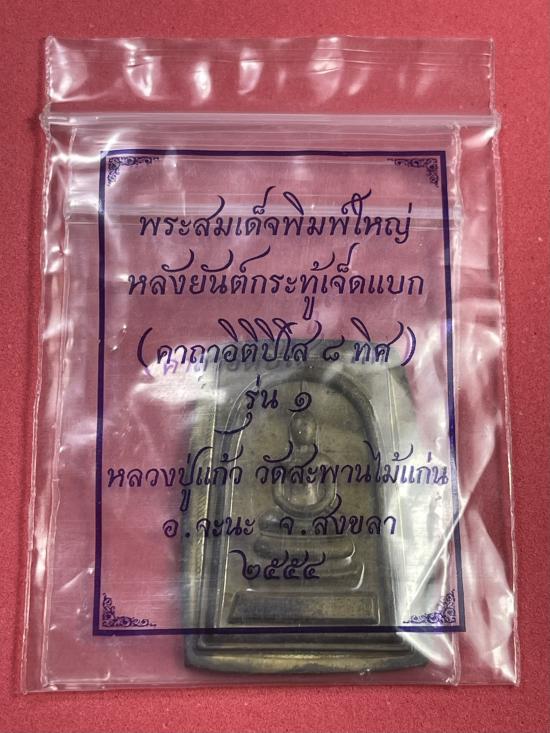 พระสมเด็จพิมพ์ใหญ่ หลังยันต์กระทู้ 7 กระแบก (คาถาอิติปิโส 8 ทิศ) หลวงปู่แก้ว วัดสะพานไม้แก่น อ.จะนะ จ.สงขลา เนื้อทองเหลืองไม่ตัดปีก ตอก 5 โค๊ต รุ่น 1 ปี พ.ศ.2554 |