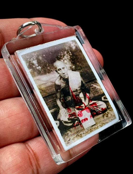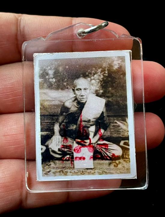 วัดใจ รูปถ่าย หลังติดหนังเสือ หลวงพ่อกลั่น วัดพระญาติการาม จ.อยุธยา เลี่ยมพลาสติก สวยงาม |