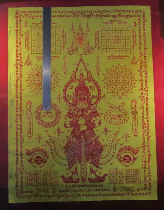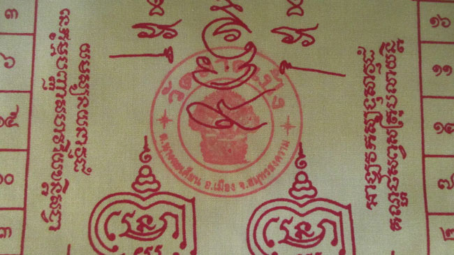 ผ้ายันต์ ท้าวเวสสุวรรณ รุ่น ๑ สร้างอุโบสถเรือนไทยมหาอุตม์ วัดลาดเป้ง ต.นางตะเคียน อ.เมือง จ.สมุทรสงคราม ครับ (สีแดง ครับ) |