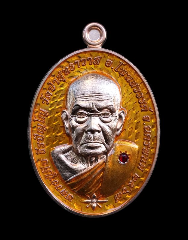 +!!เคาะเดียวllดง ตลอดสาย!!+ เหรียญ รวยสำเร็จ หลวงปู่คีบ ธีรปัญโญ วัดป่าสุทธาวาส จ.นครพนม (เนื้อกะไหล่นาก ลงยาเหลือง ฝัง CZ แดง หลังลงยาพระพิฆเนศ) พร้อมกล่องครับ