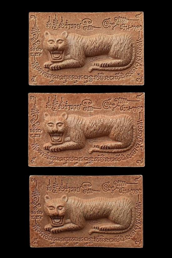 ชุด 3 องค์...เสือนอนกินทรัพย์สินพูนทวี เนื้อผงว่านยาคลุกน้ำมันเสือ หลังโรยขนเสือ + เม็ดข้าวนารอด + ก้านธูปเสก ปี 2551 หลวงปู่นิเวศน์ วัดทุ่งกระเจ็ด จ.สุพรรณบุรี พร้อมซองรูปใบฝอยเดิมจากวัด สภาพพระตามรูปที่ลงทุกประการ (ขนาดประมาณ 5.4 x 3.4 ซม.)