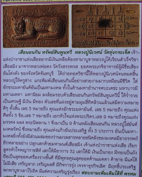 เสือทุกคนต่างรู้จักกันดีเสือเป็นสัตว์ที่น่าเกรงขาม ไม่มีข้อสงสัยเลยว่า ในโลกนี้ไม่มีใคร ไม่กลัวเสือและทุกชนาติที่รู้จักเสือแม้กระทั่งคนที่เล่นของคาถาอาคมหรือโจรสมัยก่อนก็มักจะมีเสือมาเป็นส่วนประกอบ เช่นการสักเสือเพื่อเป็นมหาอำนาจคงกระพันชาตรี หรือชื่อโจรสมัยก่อนก็มักจะเรียกว่าเสื้อขึ้นต้นกันทั้งสิ้น เมื่อเอ่ยคำว่าเสือคนก็มักจะเกรงกลัวกัน นี่แหล่ะคืออำนาจบารมีของเสือ ในทางมายาศาสตร์แล้ว เสือเป็นสัตว์ที่มีพลังทางวิญญาณ ระดับสูงอำนาจจิต เหล่านี้เมื่อ ประกอบกับ พลังอิทธิเวทย์มนต์ตราคาถาอาคมเสริมลงไปย่อมเกิดอิทธิฤทธิ์เหนือธรรมชาติ ยิ่งเสือที่มีพลังทางวิญญาณสูงถึงขึ้นเป็นพญาเสือ เพียงแต่จ้องตาเท่านั้นคนหรือสัตว์นั่นก็จะหมดแรงกลายเป็นเหยื่อให้กับได้ หลวงปู่นิเวศน์ ท่านได้หนังเสือมาจากในป่าแถว ชายแดนพม่า ท่านได้นิมิตไปว่ามีเทวดา ที่เฝ้าร่างเสือให้ ท่านได้นำร่างเสือที่ตายอยู่ในถ้ำ (เสือตัวนี้เป็นจ่าฝูงมีบริวารมากตายตามอายุขัย) กลับไปร่วมสร้างบารมีกลับท่านด้วย ท่านจึงรู้ว่าเสื้อตัวนี้สร้างบารมีไว้มากจึงจุติเป็นเทวดา ท่านจึงนำหนังและกะโหลกของเสือตัวนี้ติดตัวด้วยตลอดจนท่านมาบวชเป็นพระจึงนำหนังสือทั้งหมดมาสร้างเป็นเครื่องราง ตะกรุด แจกศิษย์ตลอดมา มีประสบการณ์ให้เห็นหลายครั้ง ล่าสุดท่านได้นำหนังส่วนหน้าผากและกะโหลกหน้าผากเสือ มาหุงกับน้ำมันว่านอาถรรพณ์ เน้นมหาอำนาจ นะจังงัง ตบะ เสริมบารมี ให้ผู้คนเกรงขาม ท่านบอกว่าเสือหากินเก่ง ไม่ต้องออกแรงมาก ก็ได้กินแล้ว เพียงแค่เสือคำราม สัตว์น้อยใหญ่ก็แข้งขาอ่อน หมดเรียวหมดแรง ยอมเป็นอาหารด้วยพลังอำนาจจากเสือ หลวงปู่ท่านจึงสร้างเป็นน้ำมันเสือนอน การพกพาก่อนออกจากบ้านด้วยพลังอำนาจของเสือช่วยเสริมตบะบารมีอำนาจเหนือผู้ใด ผู้คนเกรงขาม เป็นนะจังงังต่อผู้พบเห็น ปกครองลูกน้องเกรงขาม หรือเจรจาค้าขาย พูดจา เปรียบดังอำนาจเสือคำราม ติดต่อการงานดีมาก อำนาจเสือดังมนต์สะกด ทำให้เขาเชื่อฟังเราทุกอย่าง ช่วยปกป้องเกื้อหนุนให้ผู้ครอบครองเป็นใหญ่เป็นโต มีอำนาจดังเสือ พิเศษน้ำมันทุกขวดหลวงปู่ บรรจุตะกรุดเงินค้ำดวงชะตาเสริมบามีเพิ่มลงไป ให้ผู้บูชาได้พบแต่ความสำเร็จ ในชีวิตไม่พบแต่ความตำต่ำหรือตกอับแต่อย่างไร น้ำมันเสือนอนกินยังเน้นทางโชคลาภเรียกเงินหากินเก่งหรือทางเมตตามหาเสน่ห์ได้อีกด้วย