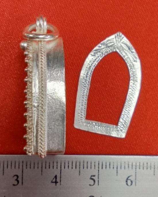 กรอบเงินสุโขทัย 96.5% ลายดอกพิกุล เนื้อหนา จอในกว้าง 1.1ซม สูง 2 ซม. ทรงสำหรับพระนาคปรกใบมะขามหรือใกล้เคียง กรอบสั่งตัดสภาพใหม่ผมสั่งไว้แล้วไม่ได้ใช้ |