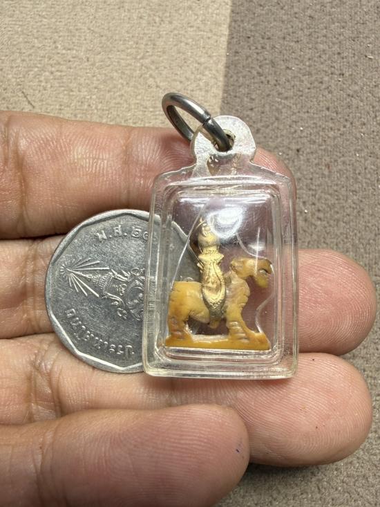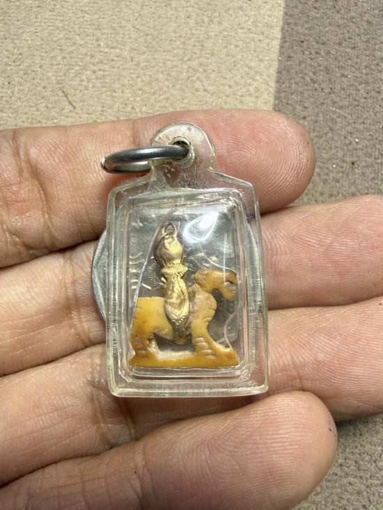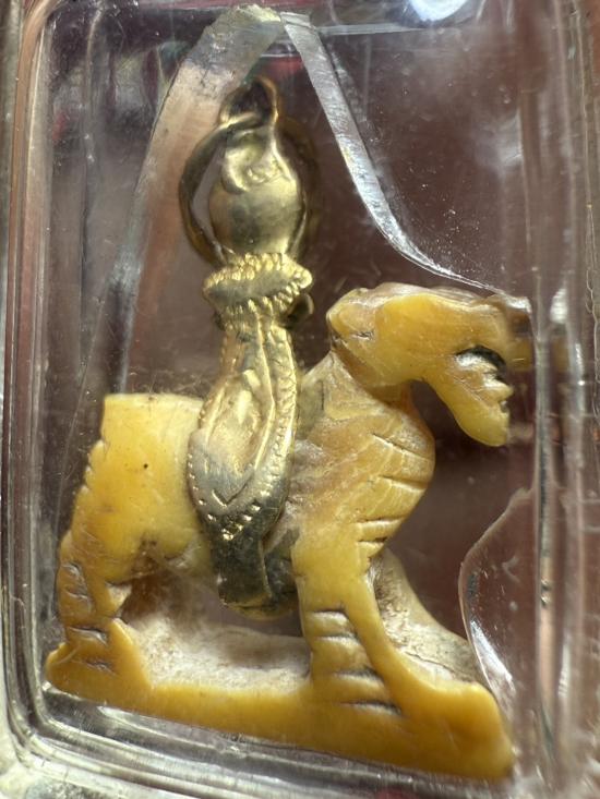 สิงห์งาแกะไม่ทราบที่ ห้อยกระเช้าทองคำแท้(ทองคำโบราณ) เลี่ยมกรอบพลาสติกกันน้ำอีกที เก่ามากครับ สภาพใช้ห่วงทองตำเกือบขาด |