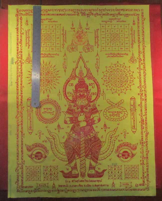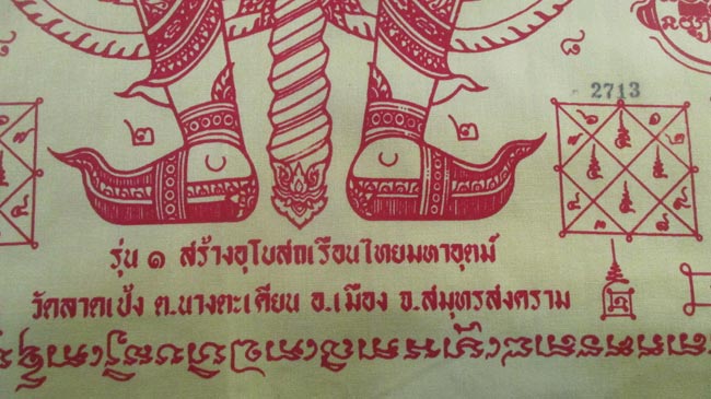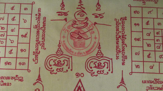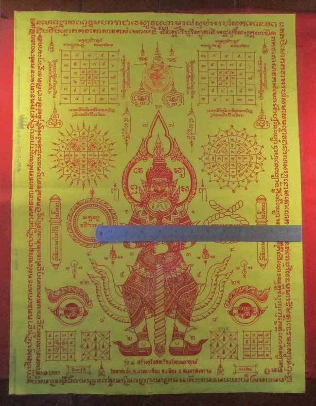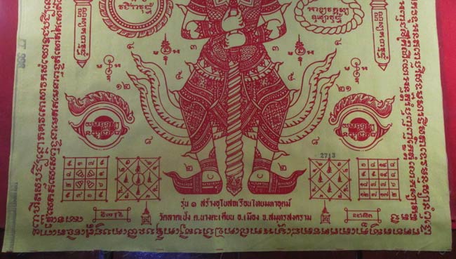 ผ้ายันต์ ท้าวเวสสุวรรณ รุ่น ๑ สร้างอุโบสถเรือนไทยมหาอุตม์ วัดลาดเป้ง ต.นางตะเคียน อ.เมือง จ.สมุทรสงคราม ครับ (สีแดง ครับ) |