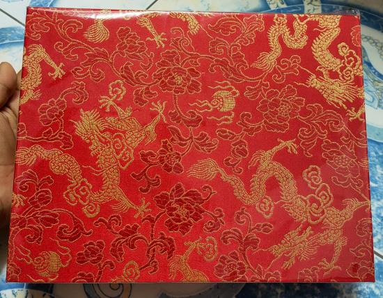 รายละเอียด กล่องเครื่องประดับ หุ้มผ้าไหมสีแดงลายมังกรและหงษ์