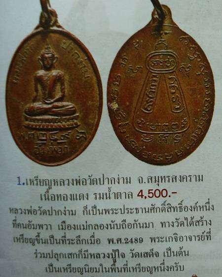 เหรียญหลวงพ่อวัดปากง่าม(วัดพระยาญาติ) สมุทรสงคราม ปี 2498 เหรียญสวย เป็นเหรียญรูปเหมือนองค์พระประธานในโบสถ์วัดปากง่าม เหรียญนี้จัดสร้างขึ้นเมื่อปี 2498 ได้นิมนต์หลวงพ่อรุ่ง วัดท่ากะบือ หลวงพ่อเนื่อง วัดจุฬามณี หลวงปู่ใจวัดเสด็จปลุกเสกพร้อมทั้งเกจิอาจารย์ต่างๆในระแวกนั้น และเหรียญรุ่นนี้ก็ยังได้ลงหนังสือพระเครื่องยอดนิยมของจังหวัดสมุทรสงครามอีก ด้วย นับว่าเป็นของดีพิธีใหญ่จ.สมุทรสงครามครับ |