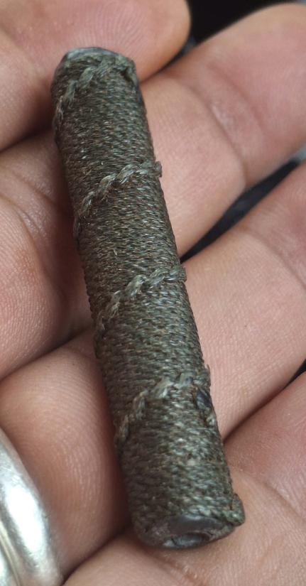 ตะกรุดเนื้อตะกั่วเก่า ถักเชือก ขนาด 2" ไม่ทราบที่ครับ |