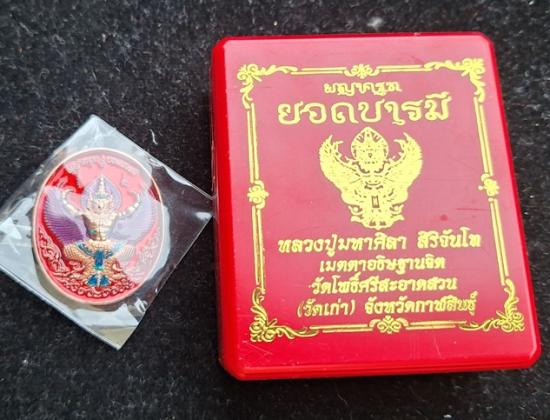 เหรียญพญาครุฑ หลวงปู่ศิลา วัดโพธิ์ศรีสะอาด รุ่นยอดบารมี ลังนำฤกษ์ เนื้อทองแดง ลงยาทรงเครื่อง ลงยาปีกครุฑ พื้นแดง No.74 |