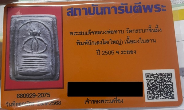 พระสมเด็จ นักเลงโต (ใหญ่) หลวงพ่อทาบ วัดกระบกขึ้นผึ้ง เนื้อผงใบลาน ปี2505 จ.ระยอง พร้อมบัตรรับรอง G-PRA |