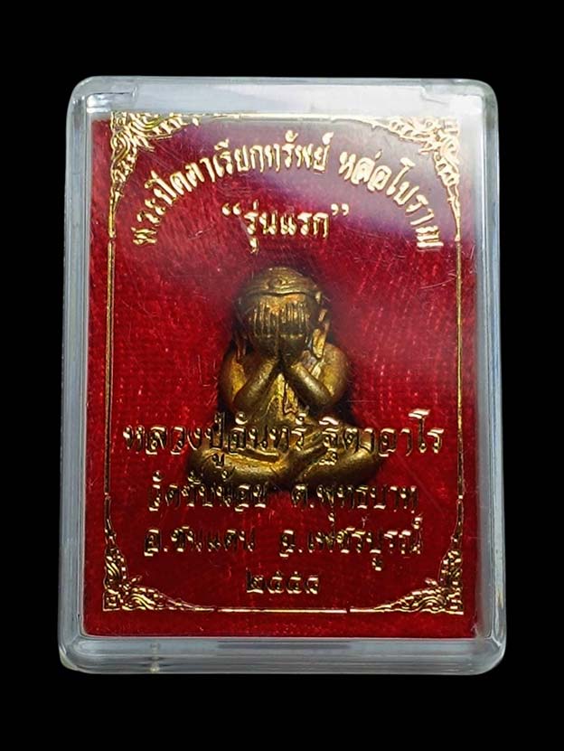 พระปิดตาเรียกทรัพย์ หล่อโบราณ รุ่นแรก (เนื้อแร่กระแสทองคำ) หลวงปู่จันทร์ วัดซับน้อย จ.เพชรบูรณ์ หมายเลข 140 ตอกโค๊ต ว.ซ.น. อุดผงพุทธคุณผสมเส้นพระเกศา พระสวย หายาก กล่องเดิมๆ ใสๆ |