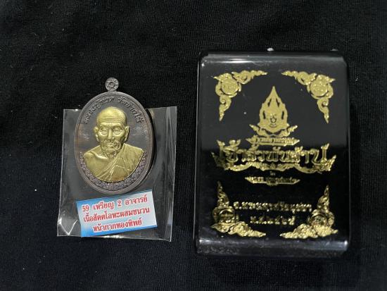 เหรียญ 2 อาจารย์ หลวงปู่ทวด-หลวงปู่ดู่ วัดสะแก เจ้าสัวพันล้าน จัดสร้างโดยคุณบอย ท่าพระจันทร์ เนื้อสัตตะโลหะผสมชนวนหน้ากากทองทิพย์ หมายเลข 3281 พร้อมกล่องเดิม |