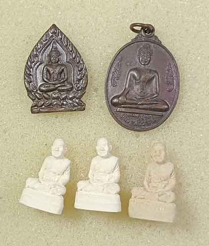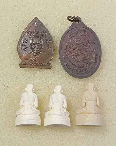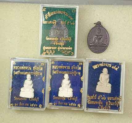 เหรียญ + รูปเหมือนลอยองค์ เนื้อผง 3 องค์ หลวงพ่อจวน วัดหนองสุ่ม สิงห์บุรี +เหรียญหลวงพ่อราหุล วัดราหุลคงนิมิตร สิงห์บุรี รุ่นไม่ถอย ปี37 |