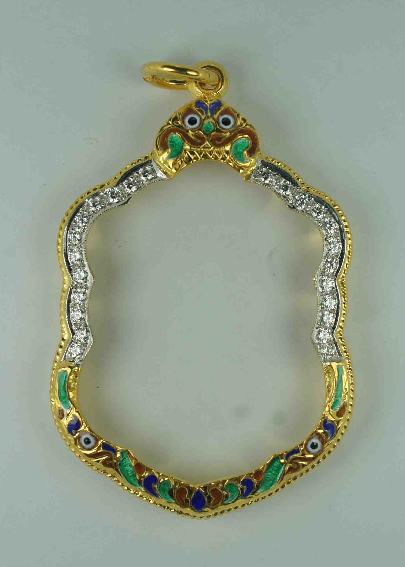 งานกรอบเงินแท้ ( มือหนึ่ง ) ชุบทองแท้ ใส่เหรียญ เสมา หลวงปู่ทิม หรือขนาดไกล้เคียง ยกซุ้ม หัวสิงห์ ฝังเพชร CZ ข้างเกลียวโปเต้ ยับทราย งานขึ้นมือ ( มาตรฐานงานตัวเดียวกับกรอบทองคำแท้ ) น้ำหนัก 10.06 กรัม ฝังเพชร CZ 24 เม็ด การันตรีโดยศรีเมืองระยอง พระเครื่อง |