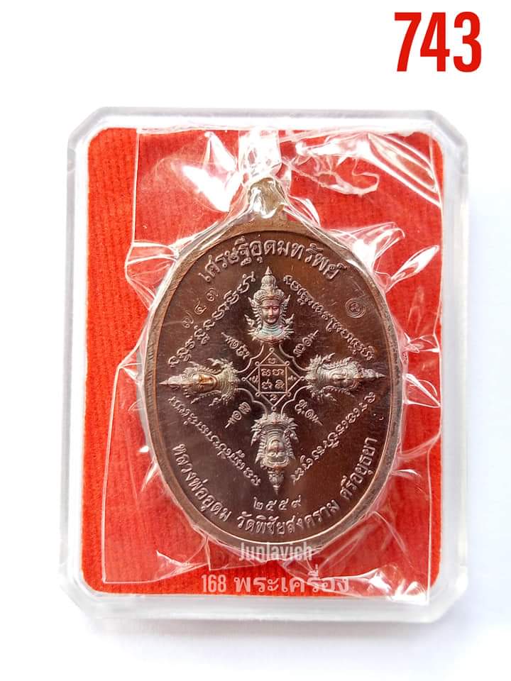 เหรียญเศรษฐีอุดมทรัพย์ หลังรัศมีพรหม เนื้อทองแดง เวลาเอียงเหรียญ จะเห็นเป็นเหลือบๆสีม่วง-รุ้งๆนิดๆ หมายเลข 743 เลข 3 หลักครับ สวยงามครับ พิธีพุทธาภิเษกวันที่ 15 ตุลาคม 2559 ณ.อุโบสถวัดพิชัยสงคราม ประกอบพิธีพุทธาภิเษกเดี่ยวโดย พระครูวิชัยกิจจารักษ์ (หลวงพ่ออุดม) วัดพิชัยสงคราม เวลา 14.00 น.
