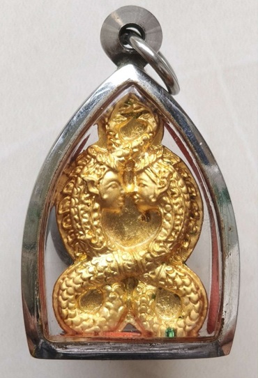 นาคเกี้ยว มหาเสน่ห์ กะไหล่ทอง ตอกโค๊ต เลี่ยมตลับสแตนเลส ไม่ทราบที่