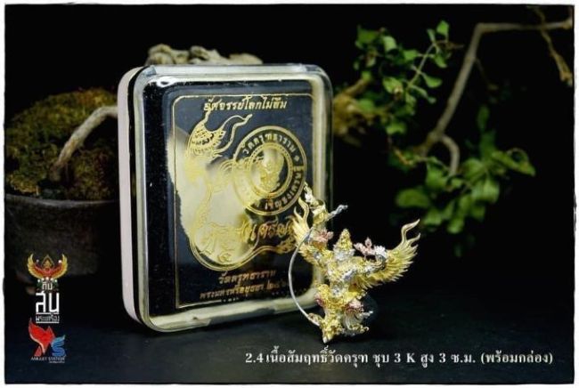พญาครุฑ รุ่นเชิญธงเศรษฐี เนื้อสัมฤทธิ์ ชุบ 3k วัดครุฑธาราม จ.พระนครศรีอยุธยา (ซีลเดิมยังไม่แกะ) |