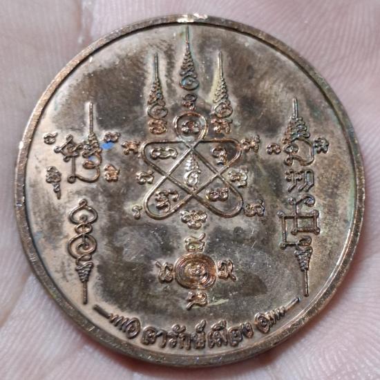 เหรียญตั้งบ้านตั้งเมือง หลังยันต์มหาอริยโสฬจใหญ่(ยันต์ฐานนคร คุุ้มครองหนุนดวงชะตาตั้งบ้านตั้งเมือง)หลวงพ่อเล็ก วัดท่าขนุน อฐิษฐานจิตปลุกเสก เนื้อทองแดง |